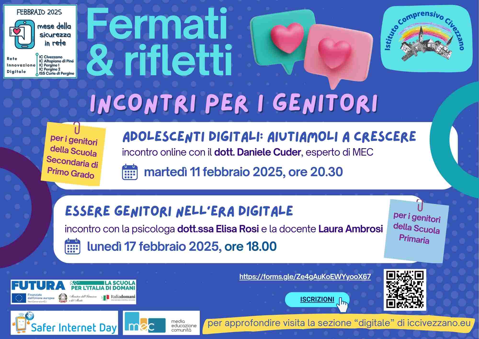 Per i genitori, sono stati organizzati due incontri formativi con esperti del settore per aiutarli a comprendere meglio le sfide del mondo digitale e supportare i propri figli nell’uso consapevole delle tecnologie: